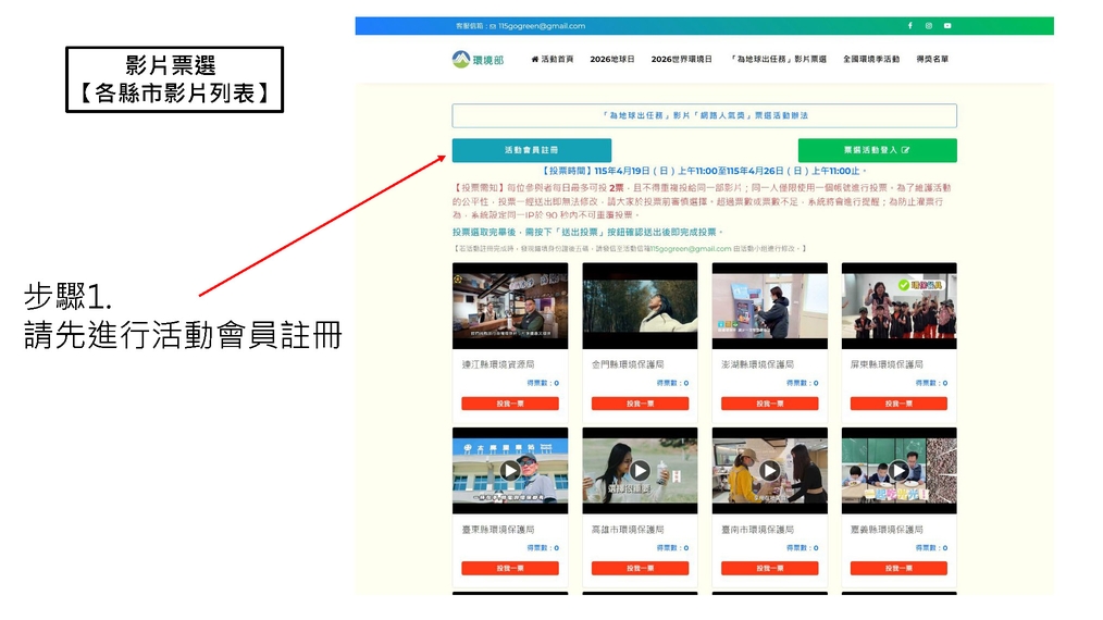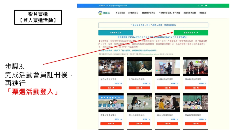 - 【人氣縣市頒獎】獲得票數前3名的縣市,將於115年5月30日(六)「世界環境日」活動當天頒獎。