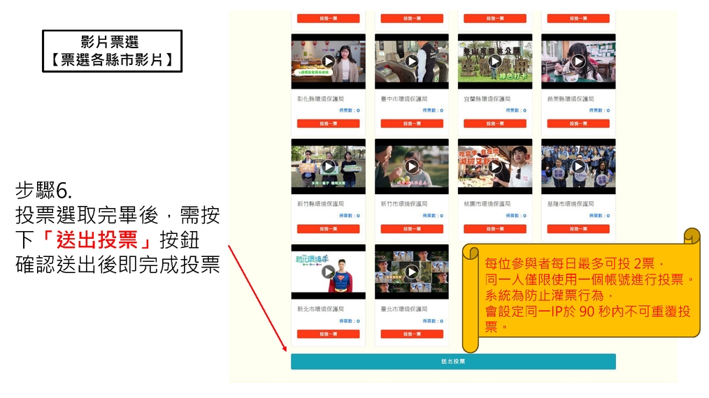 - 投票次數限制:每位參與者每日最多可投2票,且不得重複投給同一部影片;同一人僅限使用一個帳號進行投票。